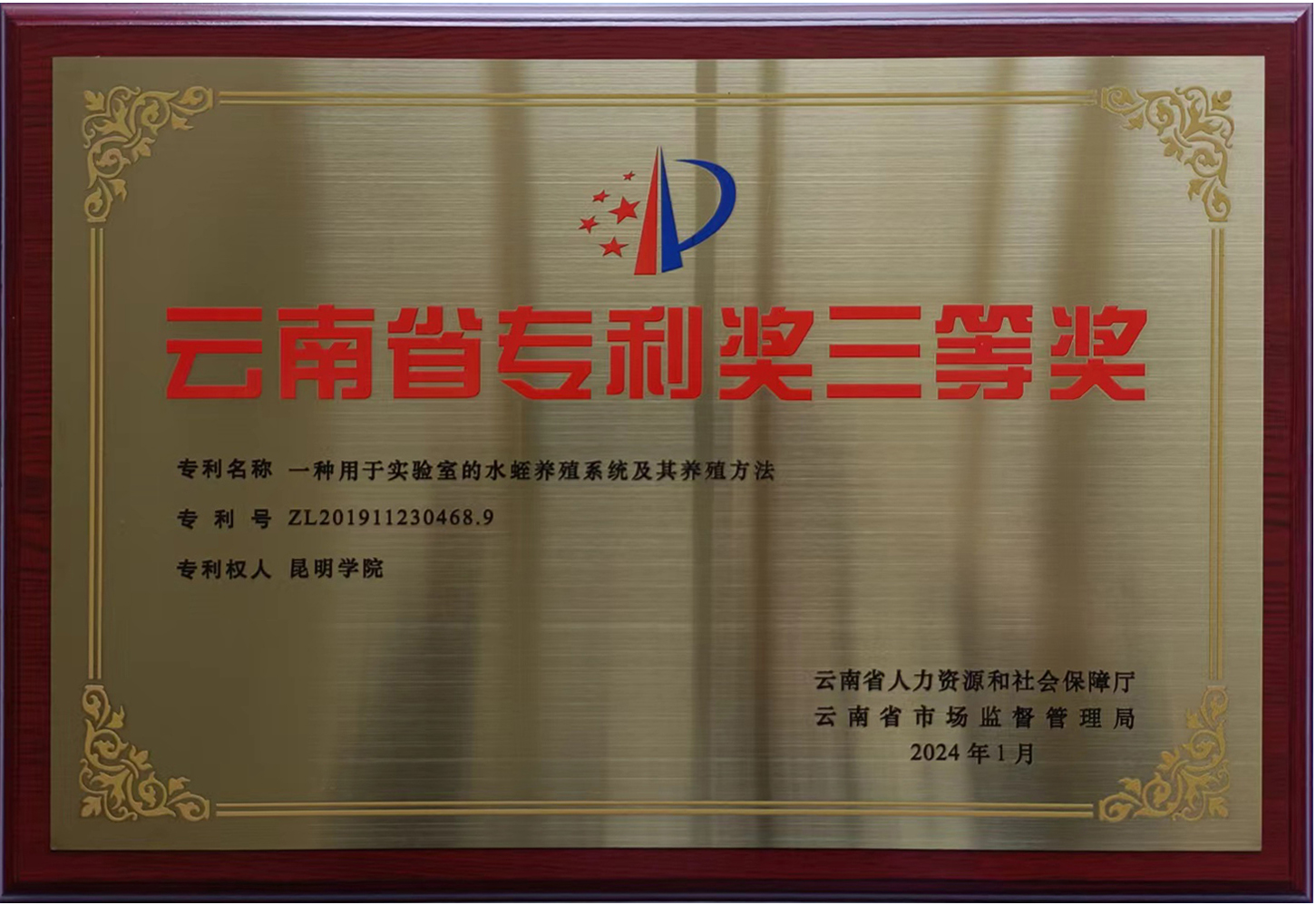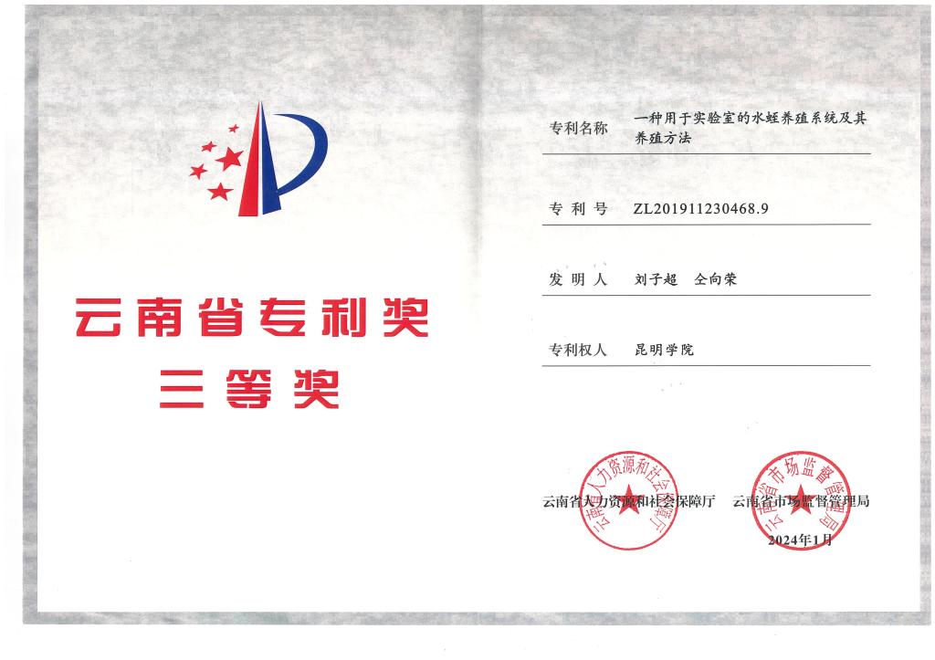 近日,云南省人力资源和社会保障厅、云南省市场监督管理局公布了2023年云南省专利奖评审结果。农学与生命科学学院刘子超博士团队的发明专利“一种用于实验室的水蛭养殖系统及其养殖方法”获得云南省专利奖三等奖,实现了beat365在该类奖项的突破,是beat365在促进科研成果转化和应用型高校建设方面取得的重要成绩。