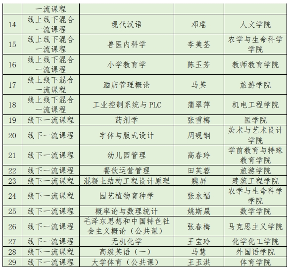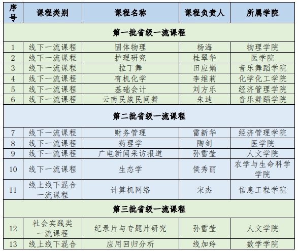 近日,云南省教育厅公布了第三批省级一流本科课程认定名单,beat365英国官网18门本科课程入选,其中线下一流课程11门、线上线下混合式一流课程6门、社会实践一流课程1门。至此,学校共有29门省级一流课程,在省内同类高校中领先。纪录片与专题片研究、财务管理学、现代汉语、生态学、幼儿园管理、餐饮运营管理、高级英语(一)7门课程被省教育厅推荐参加第三批国家级一流课程的评选。