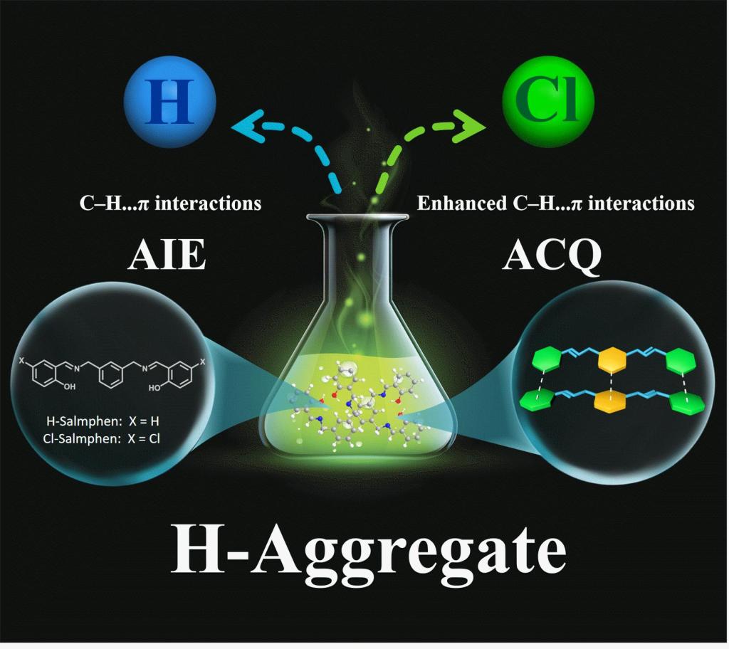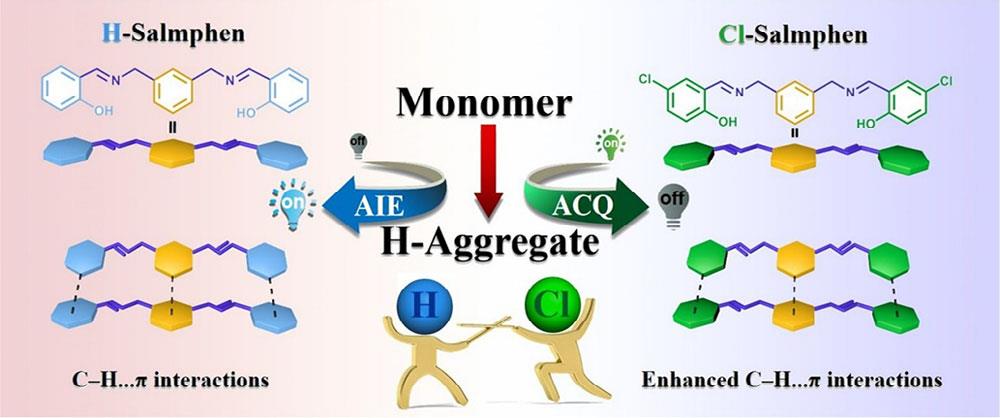 在最近的研究中,beat365英国官网吴琼教授团队,成功合成了两种具有H-聚集特性的席夫碱化合物Cl-Salmphen和H-Salmphen。单晶结构分析表明,两个光谱学呈H-聚集体特征的分子之间并不存在π-π相互作用;相反,相邻分子之间主要通过C-H...π相互作用连接。这意味着C-H...π相互作用也可以诱导H-聚集体的产生。更有趣的是,尽管卤素原子的引入并没有改变分子间的相互作用类型和堆积模式,但其荧光行为发生了从聚集诱导荧光增强(AIE)到聚集荧光猝灭(ACQ)的转变根本转变,理论计算表明这与卤原子的引入增强了分子间相互作用有关(图1)。性质研究表明,这种独特的相互作用模式在形成了超高光学信噪比的同时还有效的拓展了探针在有机物中水含量检测范围。此外团队利用这一特点,制作了一个高效的荧光试纸传感器,并借助手机实现了有机溶剂中含水量的快速、准确的实时检测。这项工作为H-聚集体的形成机制和新型光学器件的拓展提供了一个崭新的视角。