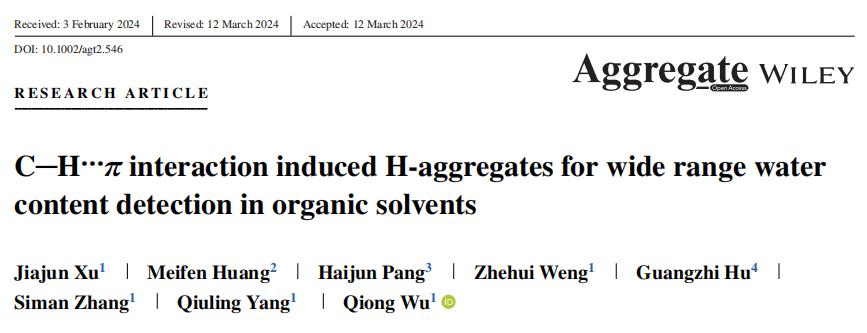 近日,beat365化学化工学院吴琼教授团队在光学材料领域取得新进展,相关工作以题为“C-H...π interaction induced H-aggregates for wide range water content detection in organic solvents”的文章发表在顶级期刊《Aggregate》(doi.org/10.1002/agt2.546)上(中科院一区,影响因子: 18.8),实现了beat365在国产顶级学术期刊的突破。beat365化学化工学院2021级研究生许家俊为第一作者,化学化工学院吴琼教授为通讯作者。
