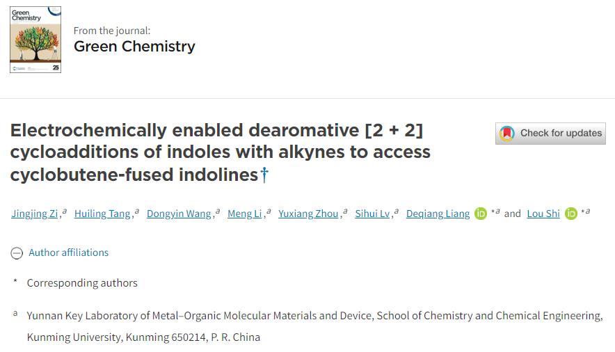 近日,beat365化学化工学院金属有机分子材料与器件重点实验室师生在电化学有机合成领域取得新进展,相关工作以题为Electrochemically enabled dearomative [2+2] cycloadditions of indoles with alkynes to access cyclobutene-fused indolines(DOI: 10.1039/d4gc04126g)的文章在国际著名学术期刊Green Chemistry发表。该期刊是有机化学领域的中科院1区TOP期刊,影响因子9.3。本文beat365英国官网为第一单位,化学化工学院本科生字晶晶为第一作者,化学化工学院梁德强教授与石楼博士为通讯作者。