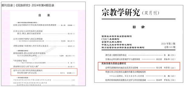 《民族研究》和《宗教学研究》分别是我国民族学、宗教学研究领域的最高级别期刊,被《中国人文社会科学期刊AMI综合评价报告(2022年)》评为顶级刊物。两篇论文分别是国家社科基金一般项目“明清西南边疆圣谕宣讲文书整理与研究”(项目编号:22ZBS061)、“明代滇黔屯堡体系与边疆治理研究”(项目编号:23BZS060)的阶段性研究成果,也是人文学院“西南新史学田野工作理论与实践创新研究”科研创新团队的标志性成果。