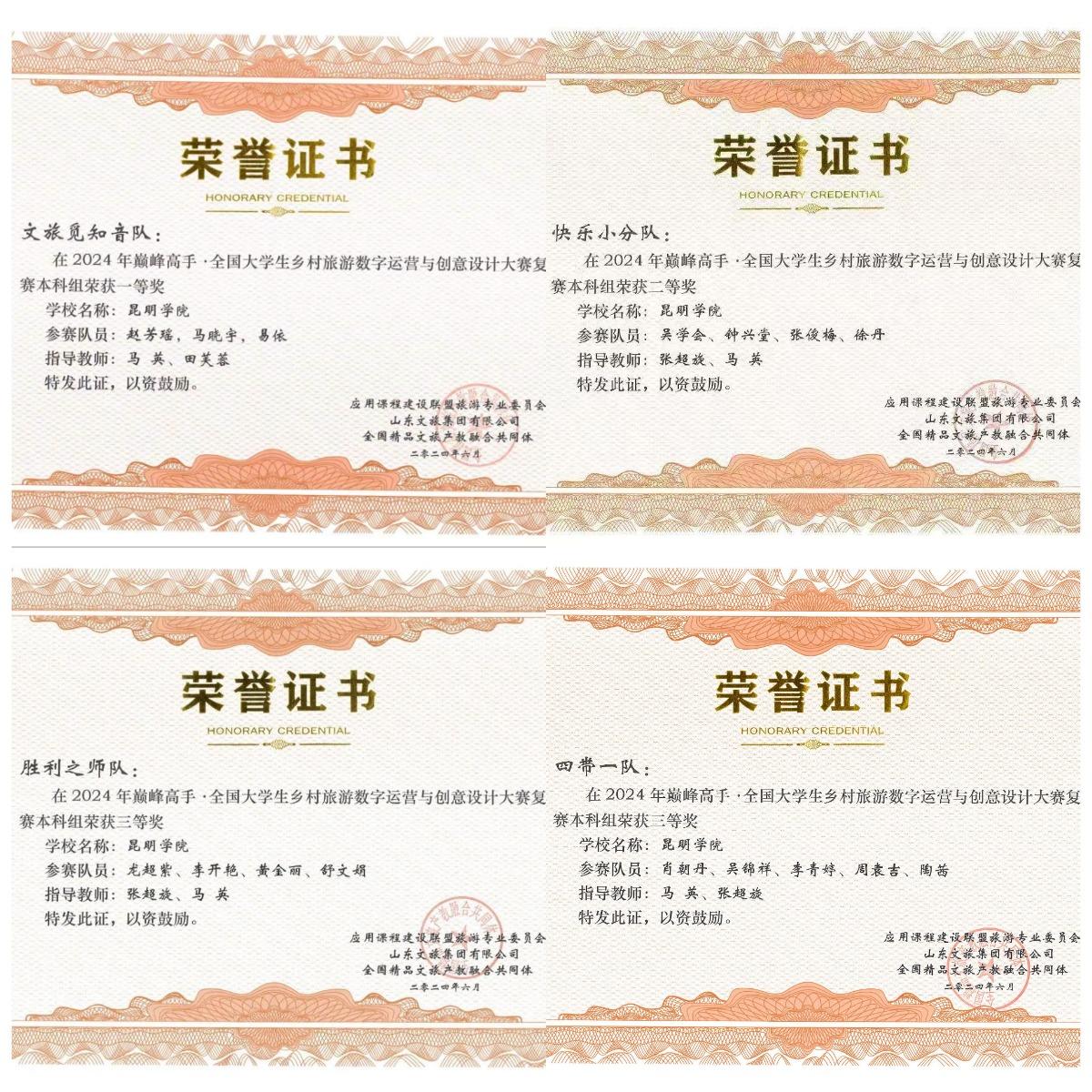5月12日-7月1日,由教育部学校规划建设发展中心、全国应用型课程建设联盟指导,全国应用型课程建设联盟旅游专业委员会主办的2024年巅峰高手·全国大学生乡村旅游数字运营与创意设计大赛开赛。beat365旅游学院选派的4支参赛队参加比赛,分别获乡村旅游线路设计(本科组)一等奖1项、三等奖1项,乡村旅游短视频设计(本科组)二等奖1项、三等奖1项。