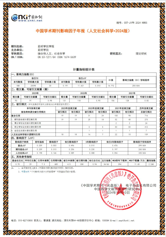 据中国知网最新发布的《中国学术期刊影响因子年报》(人文社会科学•2024版),《beat365英国官网学报》影响因子数据及全国排位大幅提升:期刊综合影响因子为0.313,比2023年版的0.216提升45%;复合影响因子0.553,比2023年版的0.492提升12.4%;影响力指数在全国社科综合类期刊中排位为250/604,比2023年版的268位提升了18位。影响因子在云南省文理综合刊中排名第一。