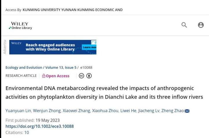 滇合中心、昆明市河湖生态健康评估与修复院士工作站林渊源、赵峥等老师2023年在Ecology and Evolution期刊上发表的论文“Environmental DNA metabarcoding revealed the impacts of anthropogenic activities on phytoplankton diversity in Dianchi Lake and its three inflow rivers”名列该期刊“2023年最高引用量前十名”。论文作者均获得了高被引作者证书。