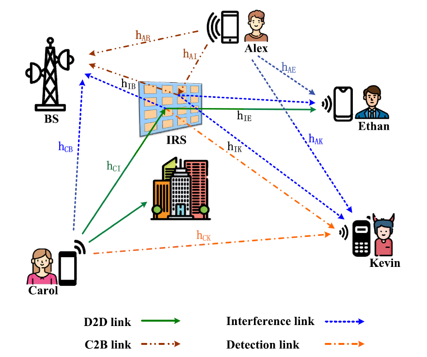 本研究针对智能反射面(Intelligent Reflecting Surface, IRS)辅助的设备到设备(D2D)网络中的隐蔽通信问题展开深入研究。论文在含有基站、蜂窝用户、D2D用户对及监测者的系统中,引入IRS以提升隐蔽通信性能。研究首次在Rician信道下推导了监测者的检测误差概率及最优检测阈值,进而分析了D2D链路与蜂窝链路的传输中断概率,并构建联合优化模型,对蜂窝用户与D2D发送端的传输功率、IRS的反射相位与幅度进行联合优化,从而最大化D2D用户的隐蔽传输速率。最后,论文通过大量仿真验证了所提方案的有效性,结果表明IRS能够显著提升隐蔽通信的速率性能,为未来6G网络中的安全通信提供了重要理论参考。