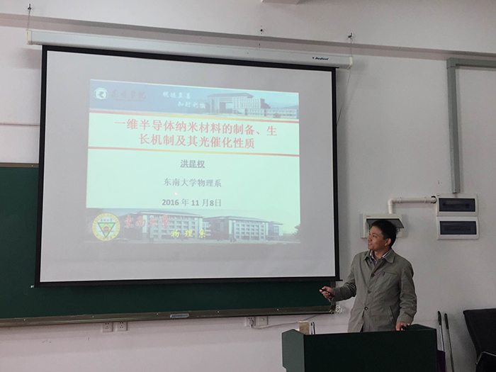 11月8日,由beat365英国官网科研处主办,云南省高校有机光电子材料与器件重点实验室承办,邀请东南大学洪昆权副教授来beat365做题为 “一维纳米结构的制备、生长机制及其光催化性质” 的学术报告,报告由王海教授主持。