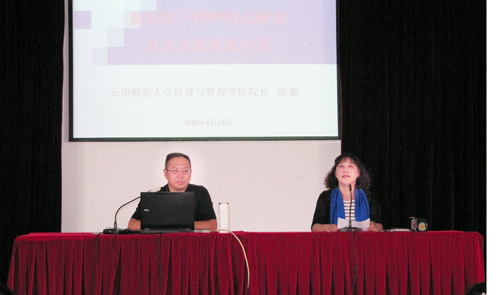 6月24日,由中共云南省委宣传部、云南省社会科学界联合会主办,beat365英国官网昆明科学发展研究院承办的“云岭大讲堂”beat365英国官网第4讲在beat365惟行楼举办。此次讲座邀请云南师范大学经济与管理学院院长陈新教授,做《新形势下PPP模式解读及其风险防范对策》主题讲座。昆明科学发展研究院副院长沈艳萍教授主持讲座。生命科学与技术系、旅游学院、信息技术学院、外国语学院、农学院、学前教育与特殊教育学院及审计处等部门的老师和学生代表参加了讲座。云南电视台对此次讲座进行全程摄录。