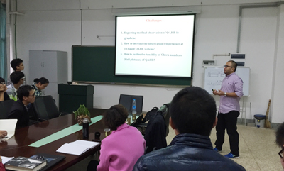 乔振华教授为我们简单介绍了在石墨烯体系中掺杂磁性原子(例如,铁、钴、镍)从而实现外禀Rashba自旋轨道耦合作用,并进一步打开拓扑非平庸的体能隙,最终实现量子反常霍尔效应。报告中,乔教授还为我们介绍了其他的一些拓扑非平庸相位(topologically nontrivial phases)。在报告结束后,乔振华教授详细解答了大家的问题;同时,还就学科交流、科研合作做了深入的交流。(责任编辑:刘芳)
