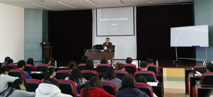 11月20日下午,beat365人文学院吴彦勤教授在惟行楼4301报告厅作了题为《国学经典与大学生通识教育》的学术讲座,这是2015年由省委宣传部、省社科联主办的“云岭大讲堂”在beat365英国官网的第八讲。