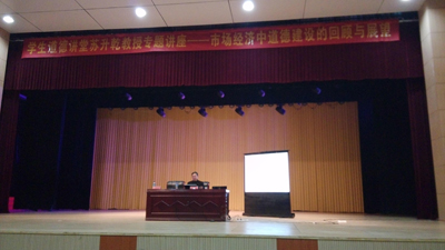 苏教授就市场经济中道德建设的三个方面为在座师生进行讲解:首先,他指出,社会主义市场经济必须利用价值规律;其次,在价值观多元化的今天,我们应该有正能量的主旋律和主导面来促进社会主义道德建设;最后,苏教授提出三个"离不开",即道德建设离不开时代的舞台、离不开社会的规律和离不开生长的约束。苏升乾教授运用史实结合人生阅历的方法,与大家分享他人生道德的智慧,激发了广大学生对道德的思考,对大学生未来的学习生活、就业方面起到积极促进的作用。