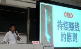 李铧老师围绕“创业商机”首先阐述了企业家该具备什么,该拥有什么样的心态;又以新兴的竹纤维产业及项目为案例分析了机会型创业与生存型创业的区别与联系;重点为大家介绍了创业的一系列方法,包括项目选择八原则、一凭三观透视法、项目成败五五诀等;最后,李铧老师根据多年经验为在场的师生们提出创业中应该注意的相关事项,赢得了全场同学的热烈掌声。